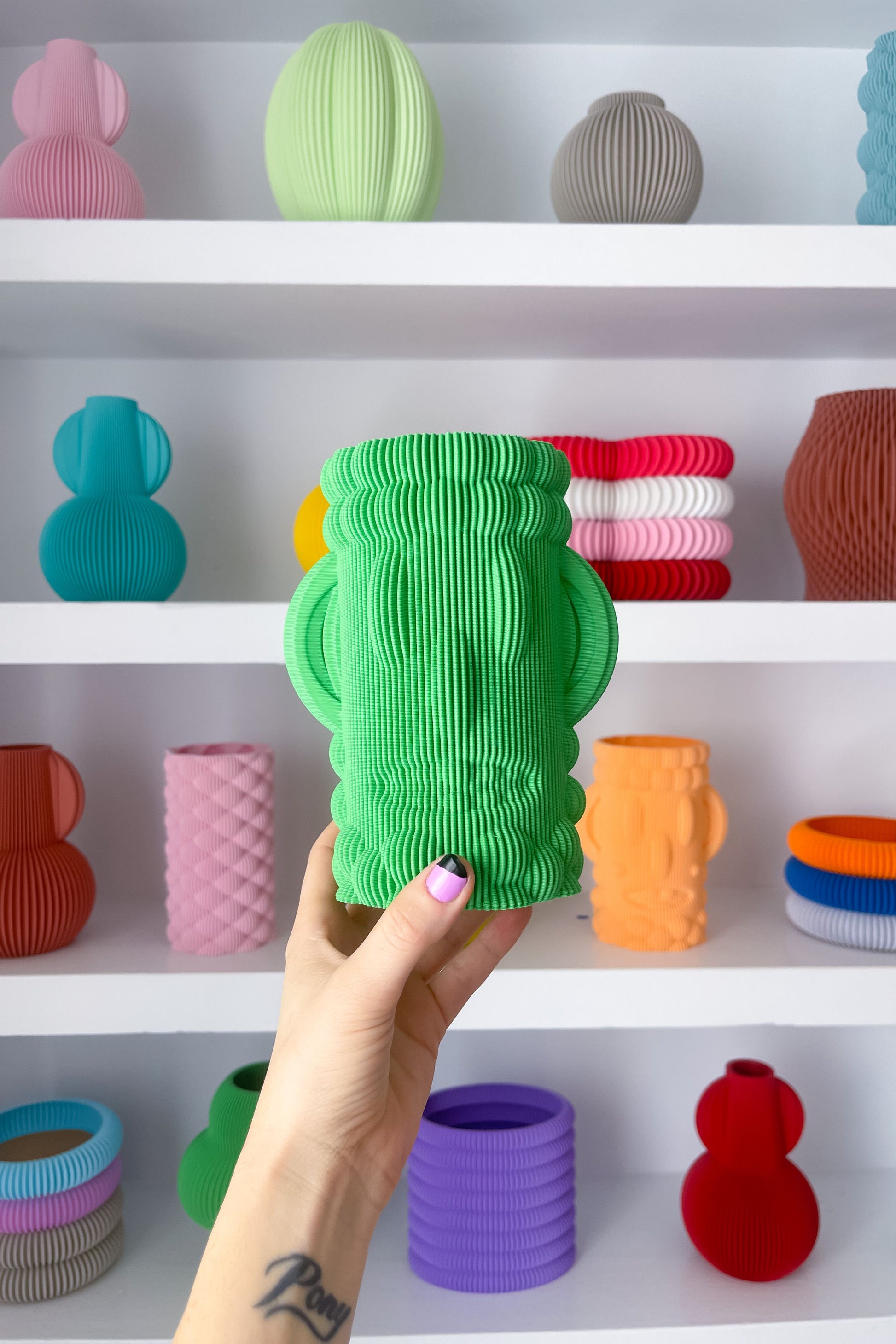 Designed in-house and brought to life with 3D printing, hand-finished and lined with cork on the bottom to keep your furniture scuff-free. Available in 37+ colors, they’re made to mix, match, and build into an organizing system that grows with your space. From bedside tables to studio desks, keep things organized without ever sacrificing style.